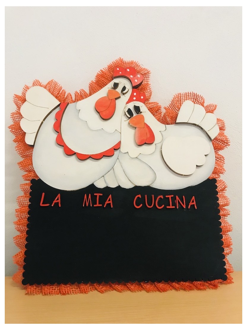 Il kit comprende il supporto in legno a forma di galline, le scritte in legno per scrivere LA MIA CUCINA, il flacone della vernice effetto lavagna da 100ml. NON SONO PRESENTI PIZZI E NASTRI E ISUPPORTI SONO TUTTI IN LEGNO GREZZO DA DECORARE