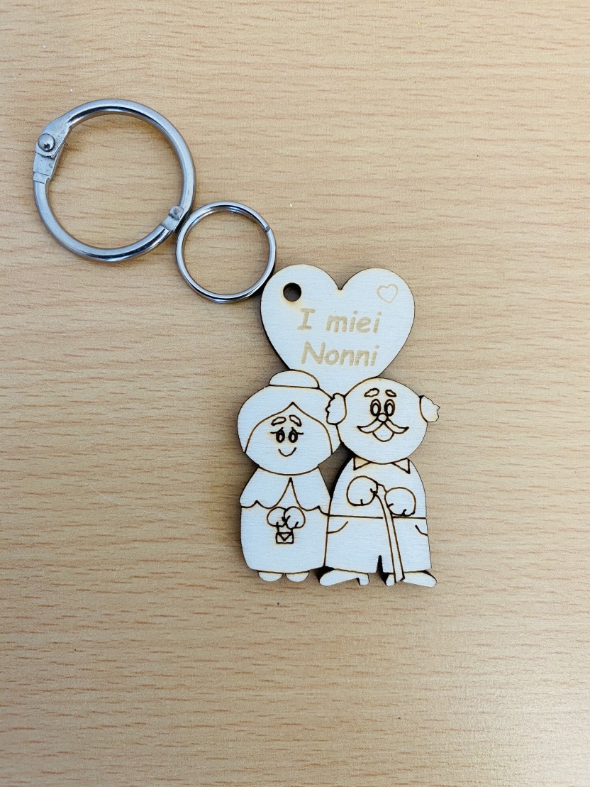 PORTACHIAVI IN LEGNO CON LA FIGURA DEI NONNI COMPRENSIVO DI INCISIONE " I MIEI NONNI", DUE ANELLI E COMPRENSIVO ANCHE DI PACCHETTO REGALO. TUTTO MADE IN ITALY